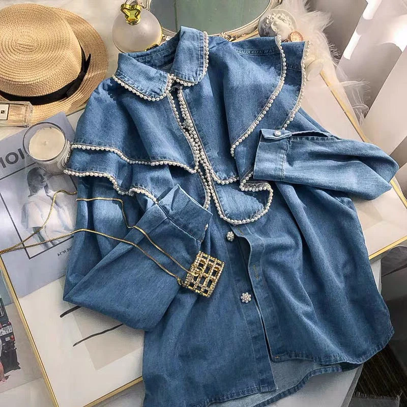 Elevate your spring wardrobe with our enchanting French Style Doll Collar Denim Blouses. These vintage-inspired blouses are designed to capture the essence of timeless fashion while offering the utmost comfort and style. With their unique pearl design and classic denim fabric, these blouses are a must-have addition to your collection.