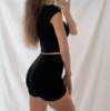 Gorgeous suit! Fits perfectly, the size matches, the length is just right for height 170. The fabric is thick, not see-through, does not fade or roll up after washing. The T-shirt fits well, can be worn separately, the shorts are flattering to the figure, everything enhances it. Great suit! The stitching is neat, the threads do not stick out, the seams are even. Delivery to Ukraine takes about three weeks. Very satisfied with the order! I recommend the seller and the store! :)